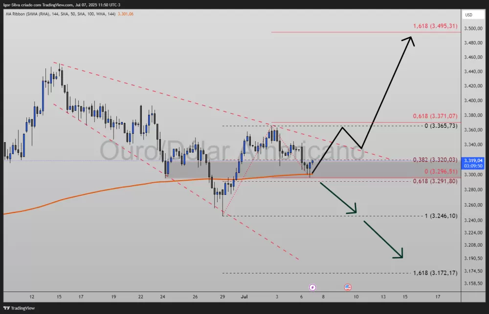O ouro tem se movimentado dentro de um canal descendente (linhas vermelhas pontilhadas) desde meados de junho, refletindo a cautela dos investidores diante de indicadores macro e dos discursos dos bancos centrais. Agora, próximo aos 3.300 USD, formou-se uma zona de suporte reforçada por três elementos-chave: